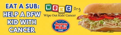 Wipe Out Kids’ Cancer (WOKC) is teaming up with 88 Jersey Mike’s Subs locations across DFW in March to raise funds in the fight against pediatric cancer. As part of Jersey Mike’s 15th Annual Month of Giving, the campaign will culminate on Wednesday, March 26, with 100% of all sales donated to WOKC in support of DFW kids (and their families) battling cancer.